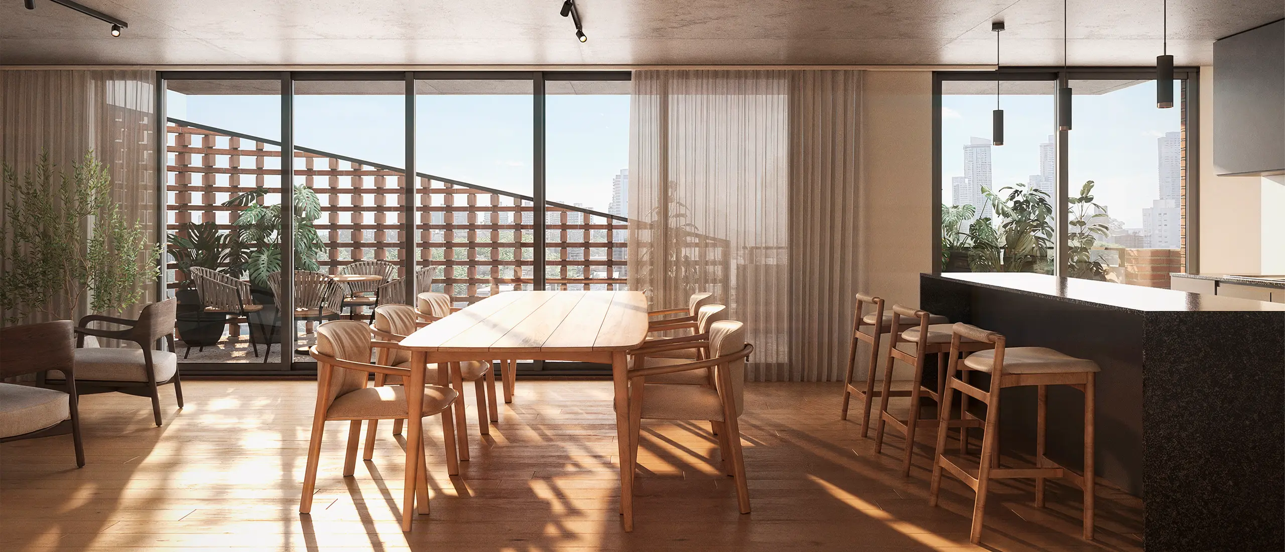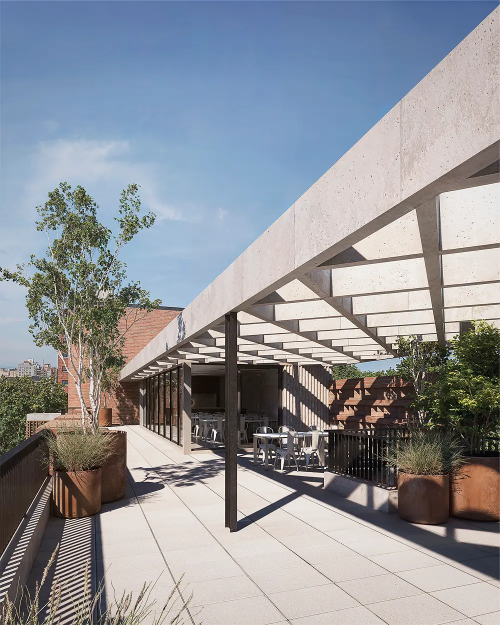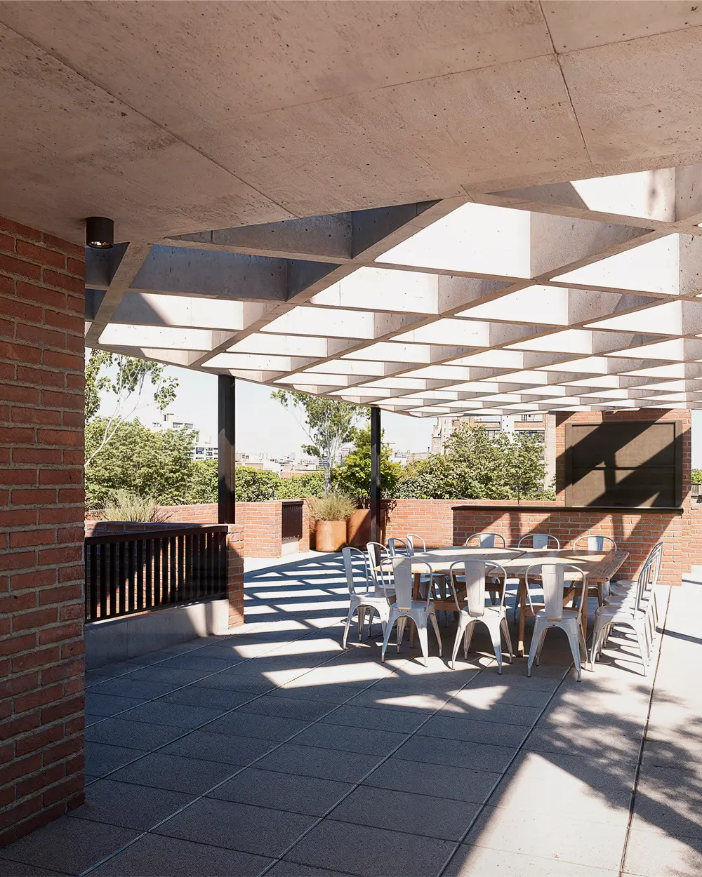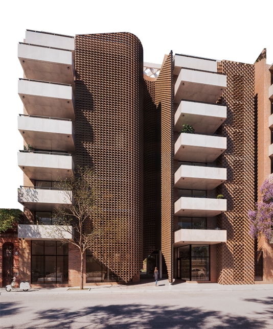 Esta característica transforma al proyecto en un edificio diferente, diseñado para aprovechar la tranquilidad del centro de manzana y el verde proyectado de su patio central, trasladando esa serenidad al interior de cada vivienda.